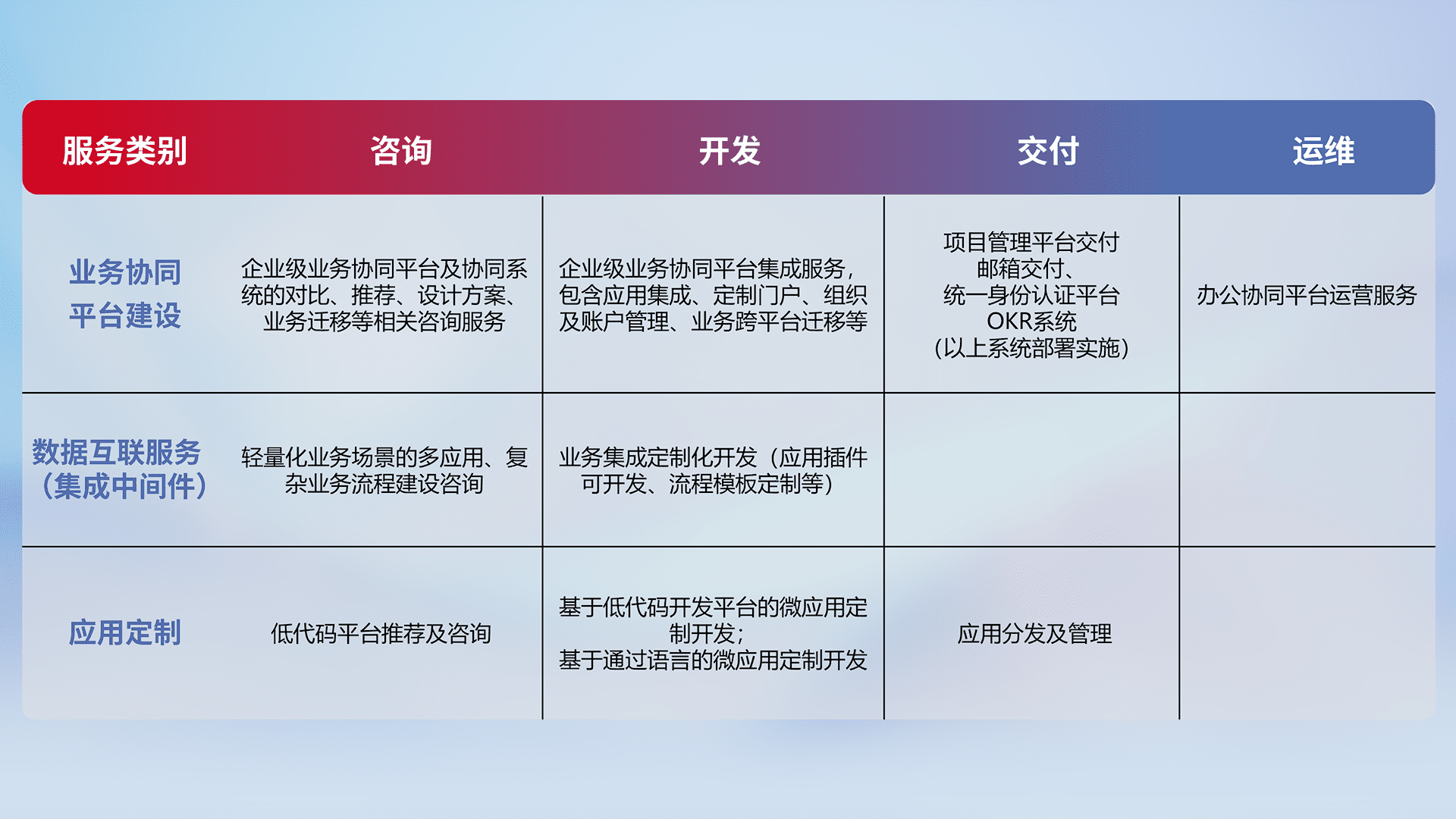 针对钉钉、、企微、、、、IDaas等平台级产品提供产品的规划、、、、方案、、交付、、、、定制化开发等服务,,实现如统一协同办公、、、、智能客户服务、、、、混合会议管理、、、智能数据查询、、等业务场景,,,实现数字化转型。。